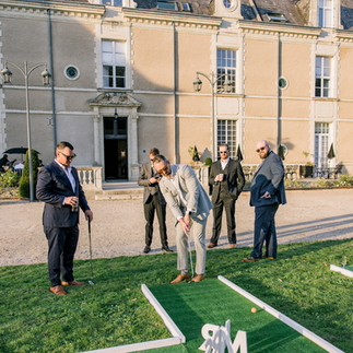 For entertainment, there was a custom mini golf course designed specifically for the event, with wedding-themed obstacles, scorecards, and a prize for the winner. A fireworks show - set to music chosen by the couple - replaced traditional dancing as the main spectacle. A live painter created a real-time painting of the bride and groom, while guests watched, mingled, or played.